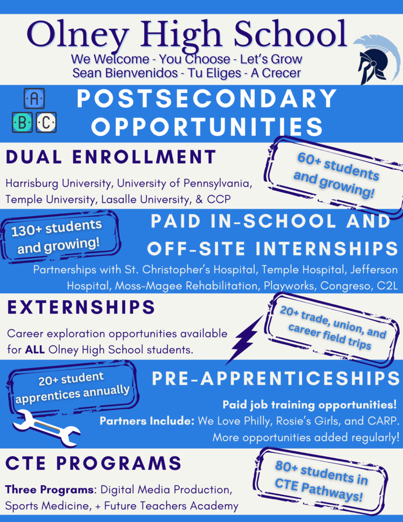 Three years ago, in 2022, in what was a national first for a high school, a charter school was turned back into a public school. The vision of the Olney leadership team, staff, and school community was to create strong postsecondary pathways for students in the Olney neighborhood. Hear from Olney students about our eight student majors (now nine- College Magnet Preparation), union pre-apprenticeship programs, college dual enrollment programs, and paid student internship opportunities. The Olney team is just getting started! We can’t wait to continue to build on these amazing programs and watch our students go on to change this world for the better!
